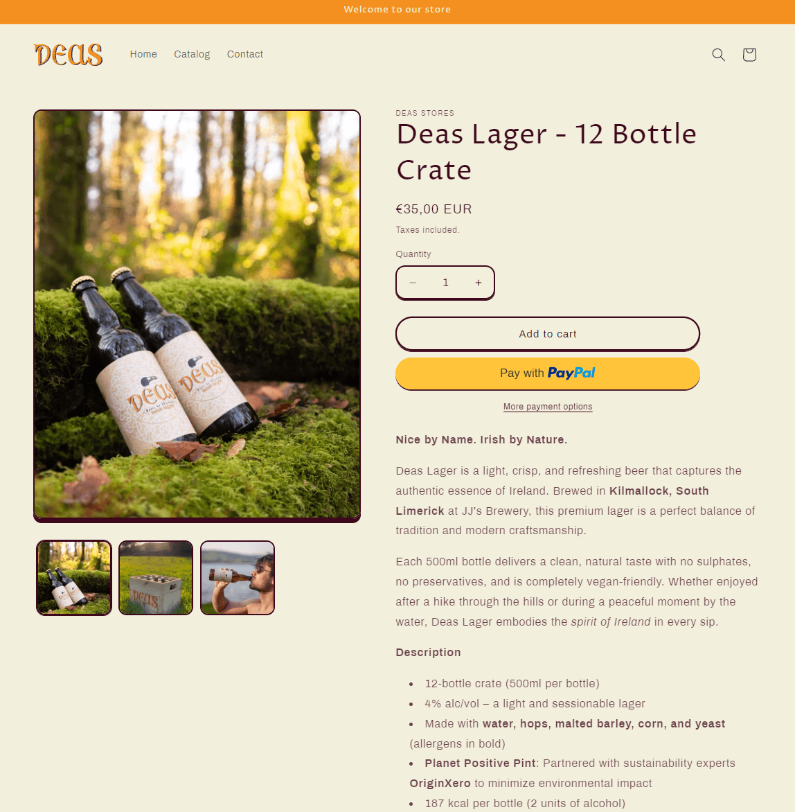 The website was designed as a streamlined sales funnel to showcase the beer and communicate the refreshed brand identity. Built using a Shopify template, the focus was on simplicity and usability, ensuring customers can easily navigate the site without distraction. Bold visuals, intuitive navigation, and cohesive branding create a user-friendly experience that stays true to Deas’s values of authenticity and simplicity.